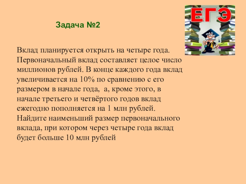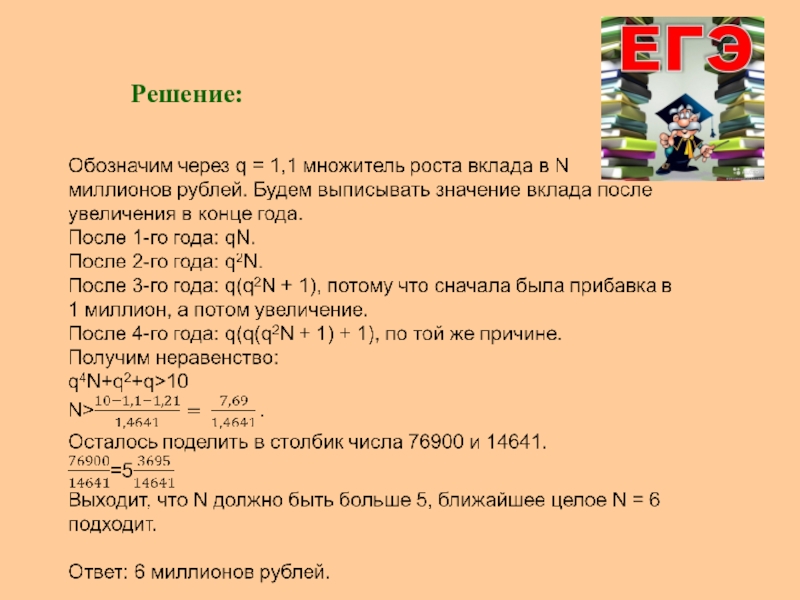 число миллионов рублей. В конце каждого года вклад увеличивается на 10% по сравнению с его размером в начале года, а, кроме этого, в начале третьего и четвёртого годов вклад ежегодно пополняется на 1 млн рублей. Найдите наименьший размер первоначального вклада, при котором через четыре года вклад будет больше 10 млн рублей
