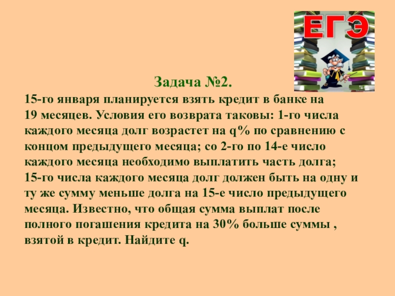 19 месяцев. Условия его возврата таковы: 1-го числа каждого месяца долг возрастет на q% по сравнению с концом предыдущего месяца; со 2-го по 14-е число каждого месяца необходимо выплатить часть долга;