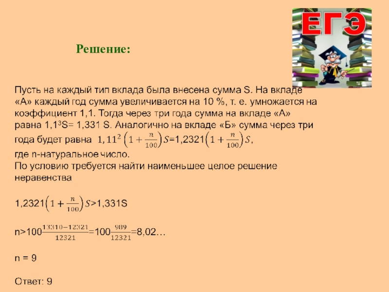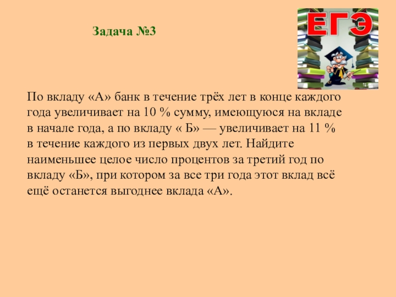 каждого года увеличивает на 10 % сумму, имеющуюся на вкладе в начале года, а по вкладу « Б» — увеличивает на 11 % в течение каждого из первых двух лет. Найдите наименьшее целое число процентов за третий год по вкладу «Б», при котором за все три года этот вклад всё ещё останется выгоднее вклада «А».