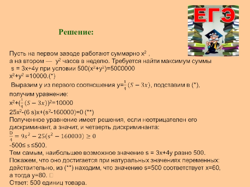 производятся абсолютно одинаковые товары, но на заводе, расположенном во втором городе, используется более совершенное оборудование. В результате, если рабочие на заводе, расположенном в первом городе, трудятся суммарно t2 часов в неделю, то за эту неделю они производят 3t единиц товара; если рабочие на заводе, расположенном во втором городе, трудятся суммарно t2 часов в неделю, то за эту неделю они производят 4t единиц товара. За каждый час работы (на каждом из заводов) Григорий платит рабочему 500 рублей. Григорий готов выделять 5 000 000 рублей в неделю на оплату труда рабочих. Какое наибольшее количество единиц товара можно произвести за неделю на этих двух заводах?
