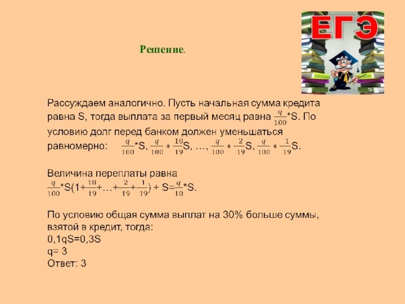 15-го числа каждого месяца долг должен быть на одну и ту же сумму меньше долга на 15-е число предыдущего месяца. Известно, что общая сумма выплат после полного погашения кредита на 30% больше суммы , взятой в кредит. Найдите q.