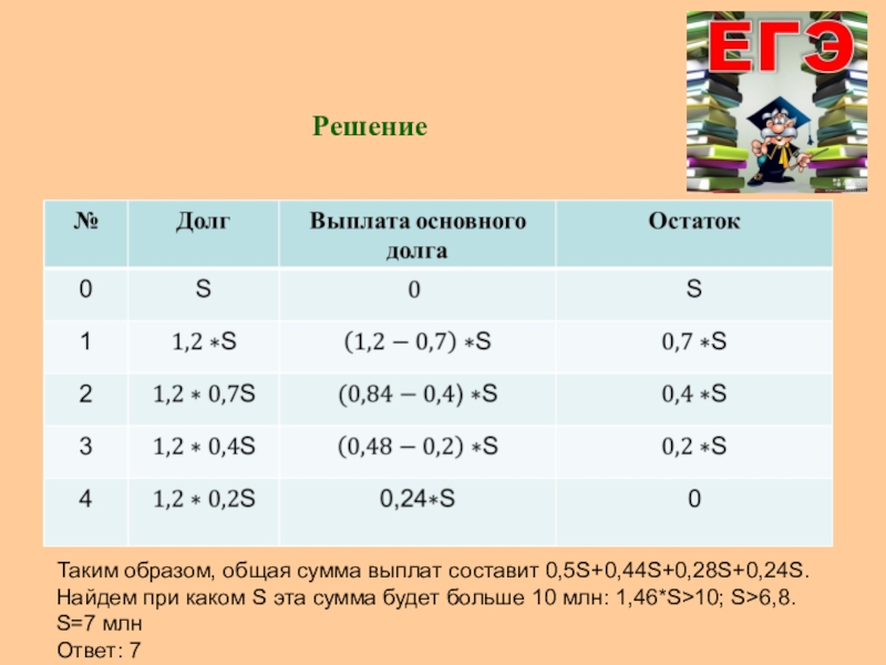 Таким образом, общая сумма выплат составит 0,5S+0,44S+0,28S+0,24S. Найдем при каком S