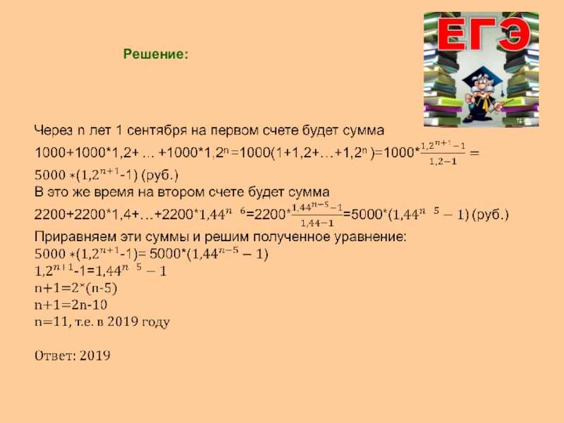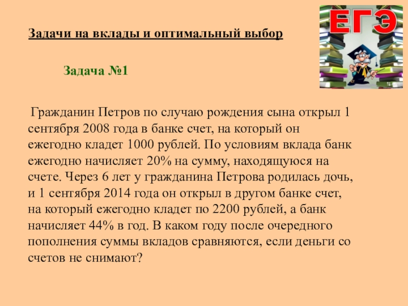 сына открыл 1 сентября 2008 года в банке счет, на который он ежегодно кладет 1000 рублей. По условиям вклада банк ежегодно начисляет 20% на сумму, находящуюся на счете. Через 6 лет у гражданина Петрова родилась дочь, и 1 сентября 2014 года он открыл в другом банке счет, на который ежегодно кладет по 2200 рублей, а банк начисляет 44% в год. В каком году после очередного пополнения суммы вкладов сравняются, если деньги со счетов не снимают?