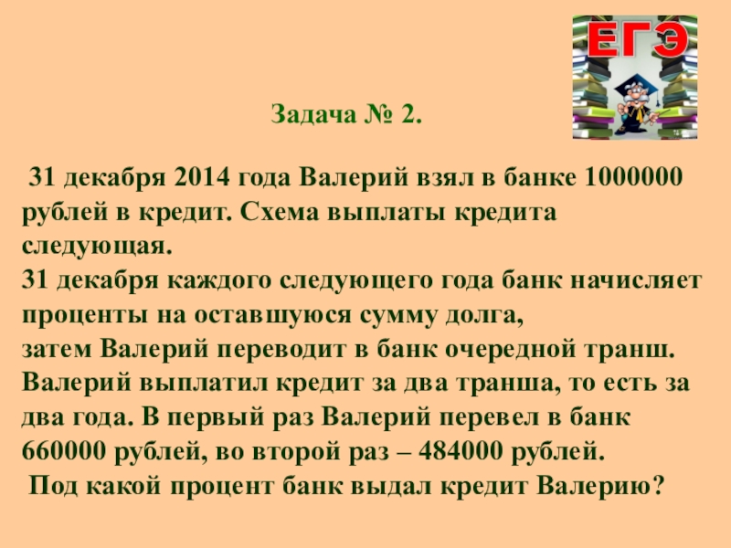 31 декабря 2014 года Валерий взял в банке 1000000 рублей в кредит. Схема выплаты кредита следующая.