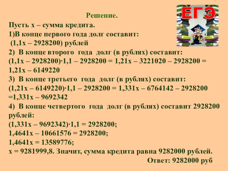 х = 9281999,8. Значит, сумма кредита равна 9282000 рублей.