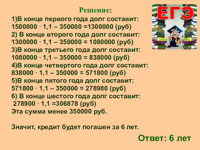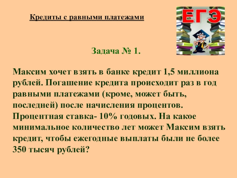 Максим хочет взять в банке кредит 1,5 миллиона рублей. Погашение кредита происходит раз в год равными платежами (кроме, может быть, последней) после начисления процентов. Процентная ставка- 10% годовых. На какое минимальное количество лет может Максим взять кредит, чтобы ежегодные выплаты были не более 350 тысяч рублей?