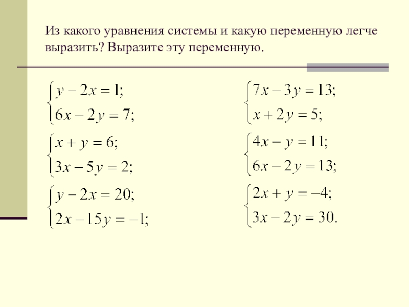 Слайд 14Из какого уравнения системы и какую переменную легче выразить? Выразите эту