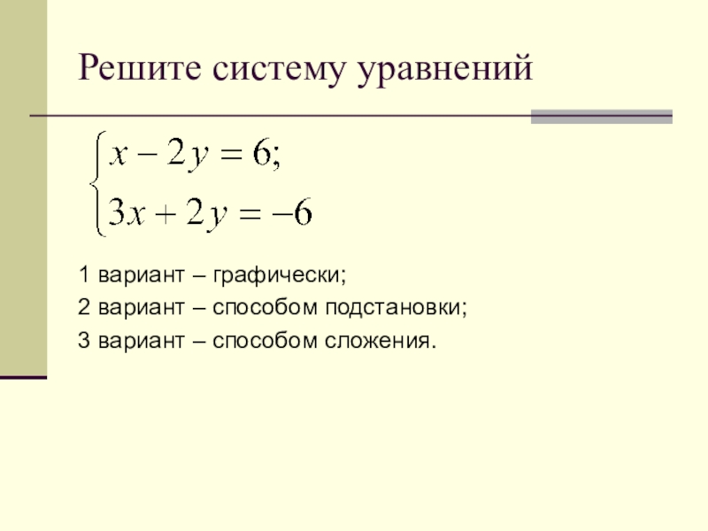 Решите систему уравнений1 вариант – графически;2 вариант – способом подстановки;3 вариант – способом сложения.