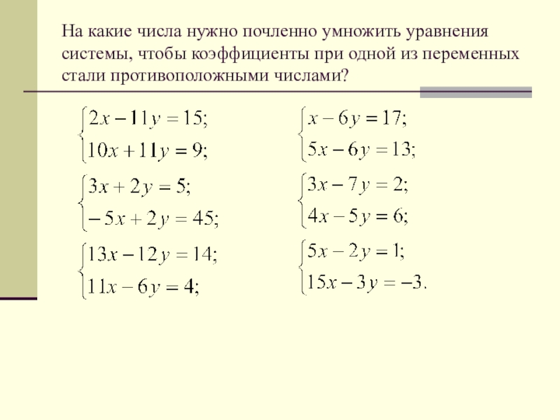 Слайд 16На какие числа нужно почленно умножить уравнения системы, чтобы коэффициенты при