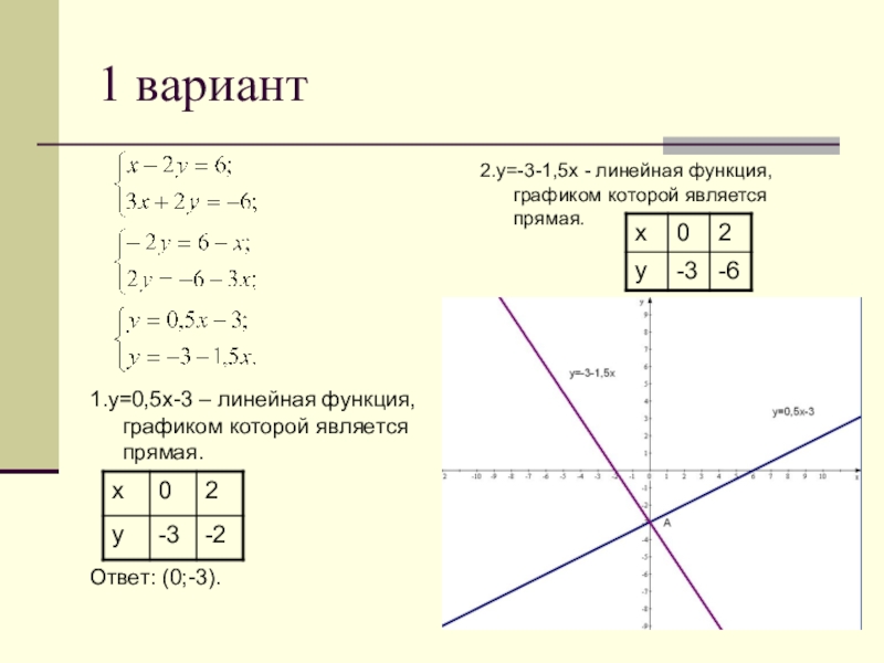 1 вариант1.у=0,5х-3 – линейная функция, графиком которой является прямая.Ответ: (0;-3).2.у=-3-1,5х - линейная функция, графиком которой является прямая.