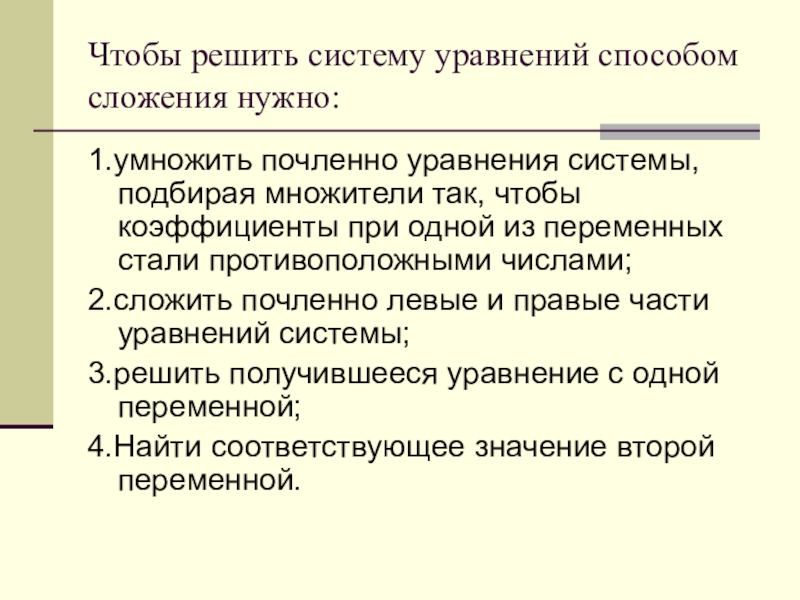 Чтобы решить систему уравнений способом сложения нужно:1.умножить почленно уравнения системы, подбирая множители так, чтобы коэффициенты при одной