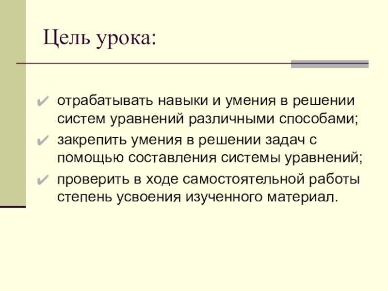 Цель урока:отрабатывать навыки и умения в решении систем уравнений различными способами;закрепить умения в решении задач с помощью составления системы уравнений;проверить в ходе самостоятельной работы степень усвоения изученного материал.