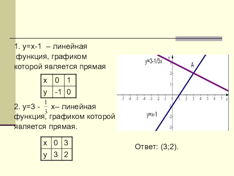 1. у=х-1 – линейная функция, графикомкоторой является прямая2. у=3 -   х– линейнаяфункция, графиком которойявляется прямая.