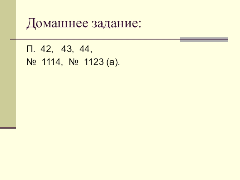 Домашнее задание:П. 42,  43, 44,№ 1114, № 1123 (а).