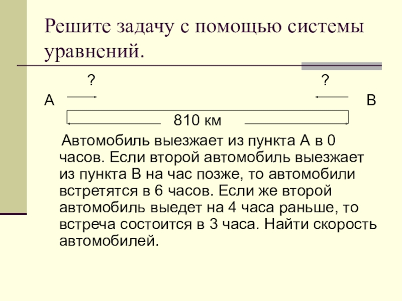 Автомобиль выезжает из пункта А в 0 часов. Если второй автомобиль выезжает из пункта В на час позже, то автомобили встретятся в 6 часов. Если же второй автомобиль выедет на 4 часа раньше, то встреча состоится в 3 часа. Найти скорость автомобилей.