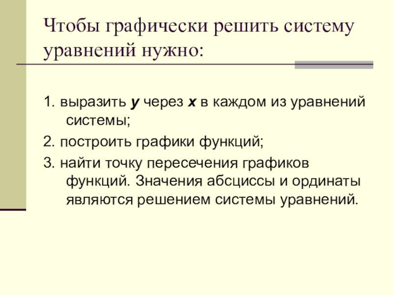 Чтобы графически решить систему уравнений нужно:1. выразить у через х в каждом из уравнений системы;2. построить графики