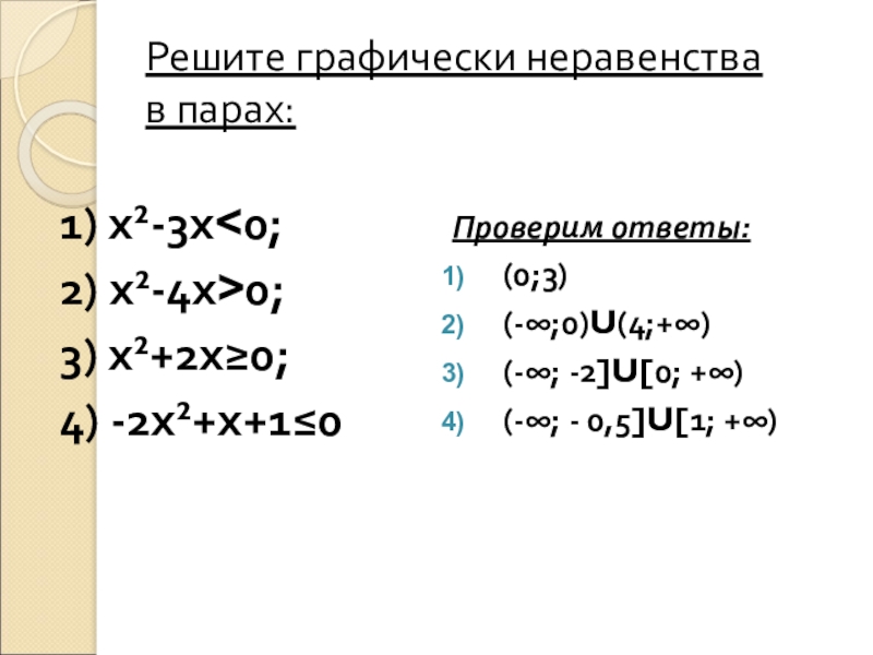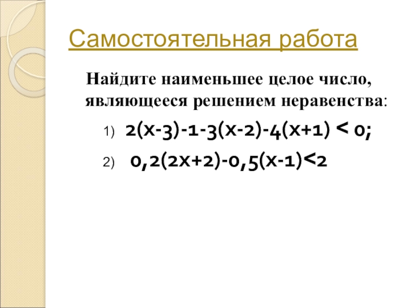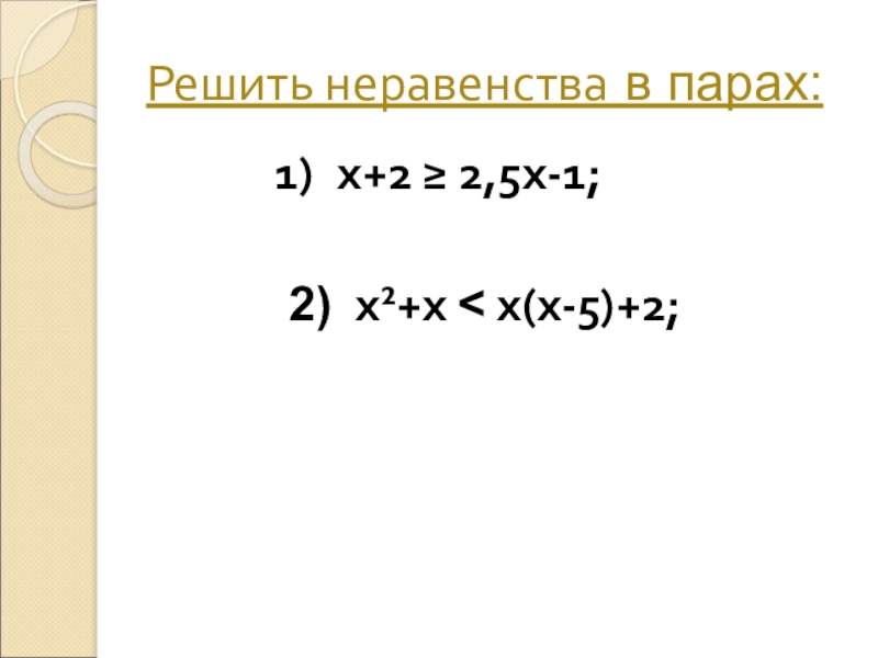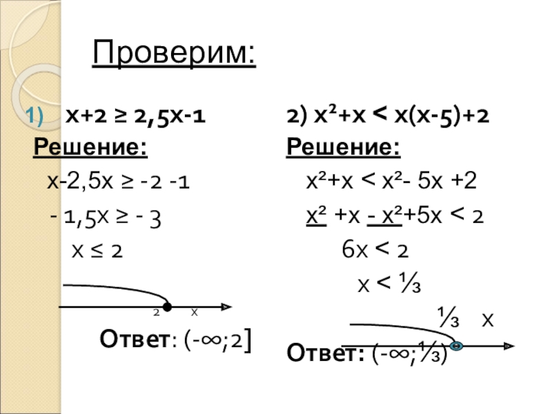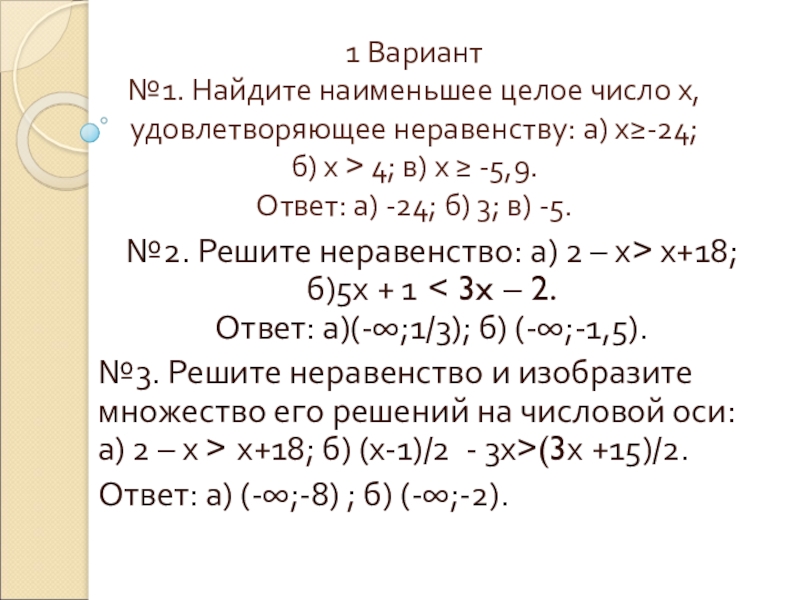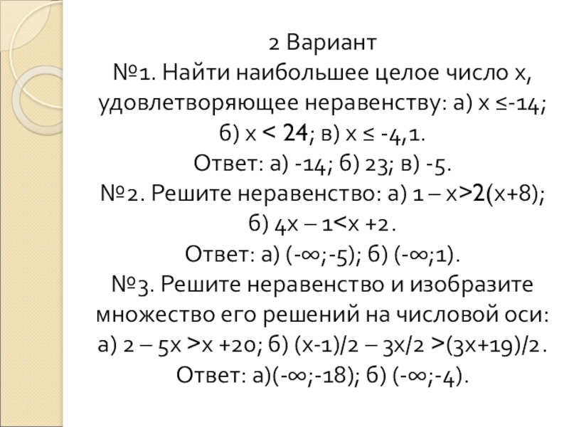 №2. Решите неравенство: а) 2 – х> х+18; б)5х + 1 < 3x – 2. Ответ: а)(-∞;1/3); б) (-∞;-1,5).