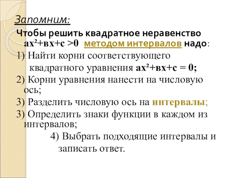 Чтобы решить квадратное неравенство ах²+вх+с >0 методом интервалов надо: