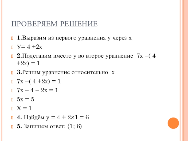 ПРОВЕРЯЕМ РЕШЕНИЕ1.Выразим из первого уравнения у через хУ= 4 +2х2.Подставим вместо у во второе уравнение 7х –( 4 +2х) = 13.Решим уравнение относительно х7х –( 4 +2х) = 17х – 4 – 2х = 15х =