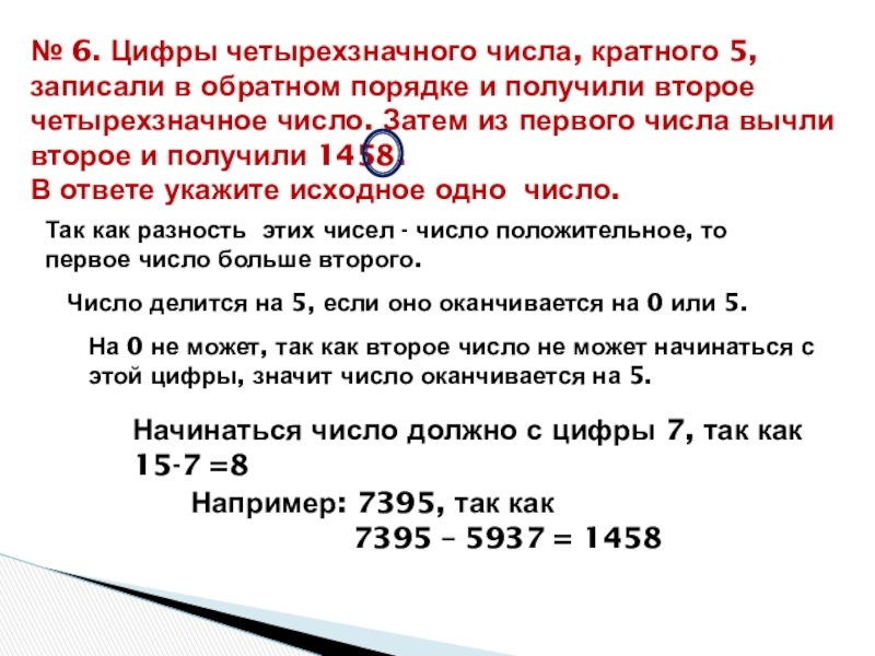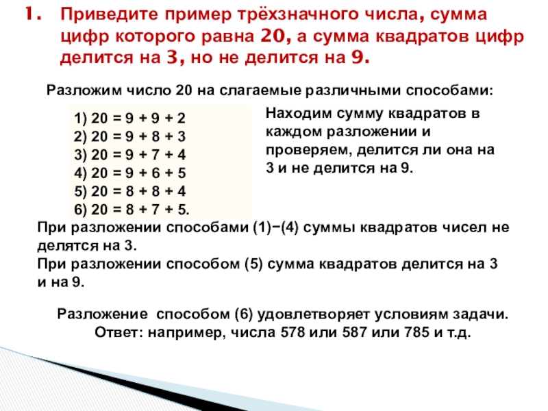 Разложение способом (6) удовлетворяет условиям задачи. Ответ: например, числа 578 или 587 или 785 и т.д.