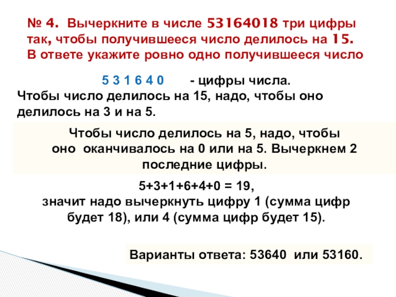 Чтобы число делилось на 5, надо, чтобы оно оканчивалось на 0 или на 5. Вычеркнем 2 последние цифры.