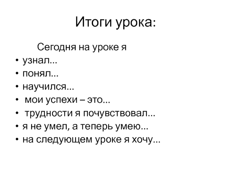 Итоги урока:     Сегодня на уроке яузнал...понял...научился... мои успехи – это... трудности я почувствовал...я
