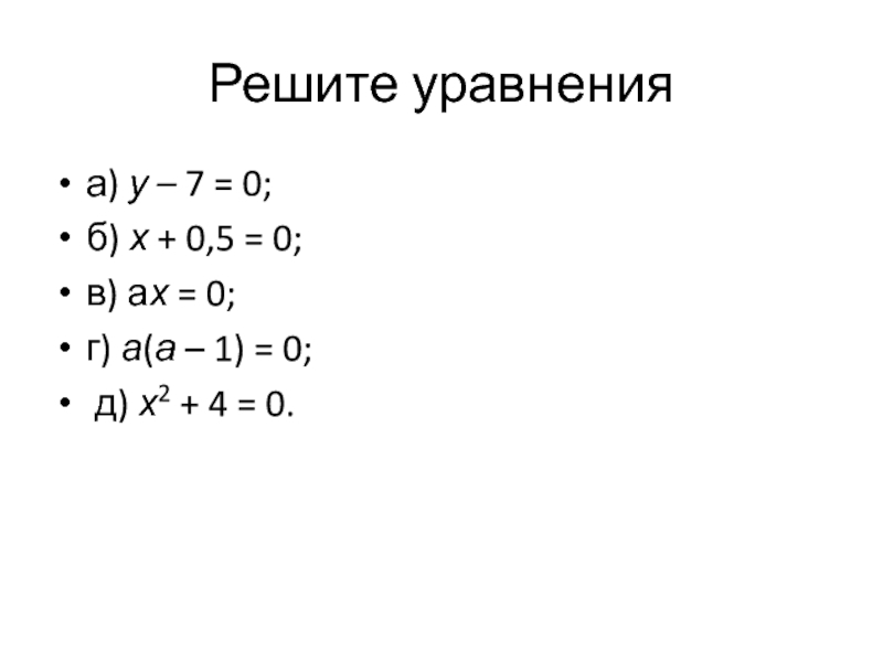 Решите уравненияа) у – 7 = 0; б) х + 0,5 = 0; в) ах = 0; г) а(а – 1) = 0; д) х2 + 4 = 0.