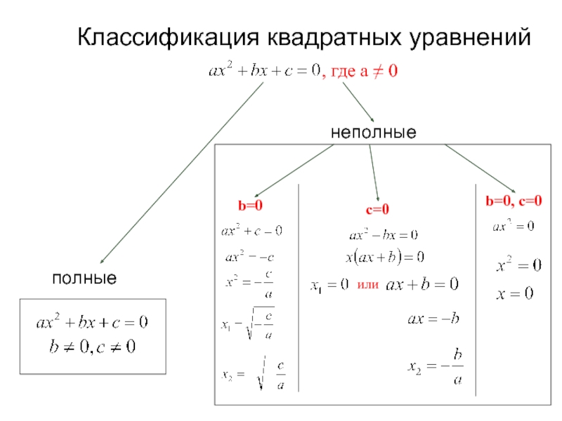 Классификация квадратных уравненийполныенеполные, где a ≠ 0b=0b=0, c=0c=0или