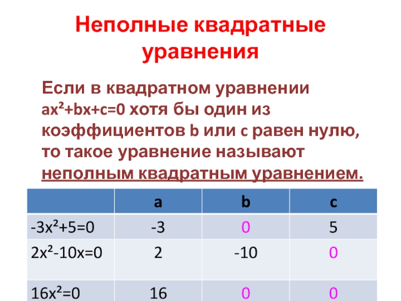 Неполные квадратные уравненияЕсли в квадратном уравнении ax²+bx+c=0 хотя бы один из коэффициентов b или c равен нулю,