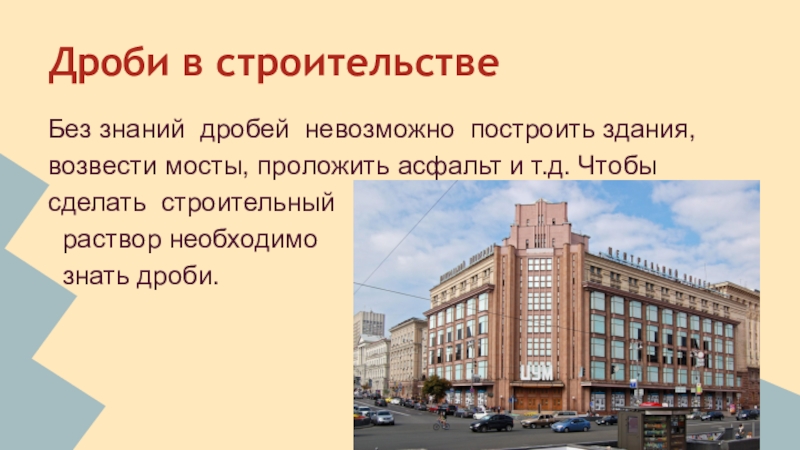 Без знаний дробей невозможно построить здания, возвести мосты, проложить