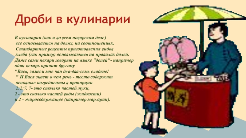 Дроби в кулинарииВ кулинарии (как и во всем поварском деле) все основывается на долях, на соотношениях. Стандартные