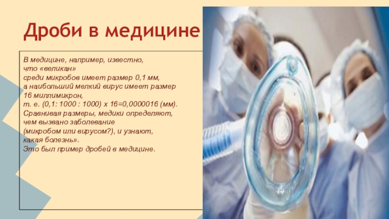 Дроби в медицинеВ медицине, например, известно,что «великан»среди микробов имеет размер 0,1 мм,а наибольший мелкий вирус имеет размер16