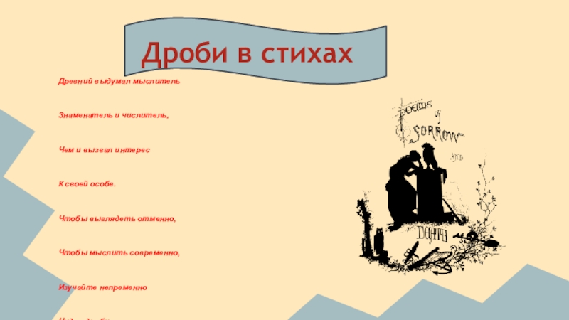 Древний выдумал мыслительЗнаменатель и числитель,Чем и вызвал интересК своей особе.Чтобы выглядеть отменно,Чтобы мыслить современно,Изучайте непременноЧудо - дроби.