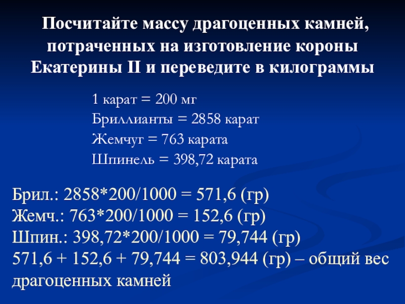571,6 + 152,6 + 79,744 = 803,944 (гр) – общий вес драгоценных камней