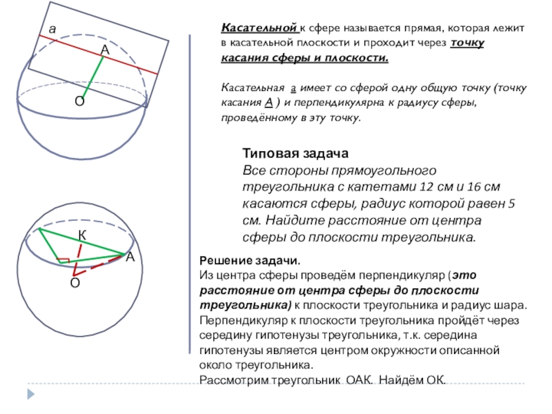 Радиус сферы, проведённый в точку касания сферы и плоскости, перпендикулярен к касательной плоскости.