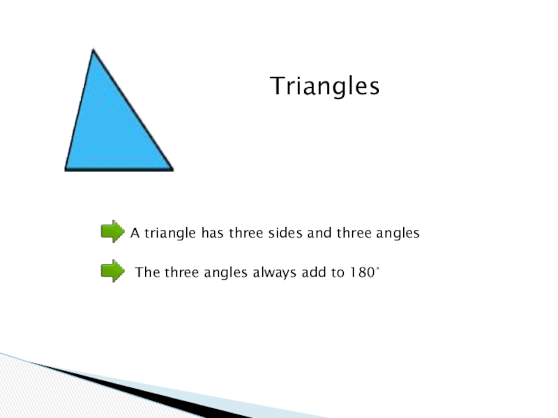 TrianglesA triangle has three sides and three angles The three angles always add to 180°