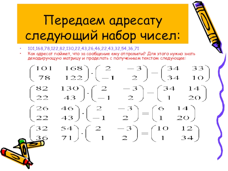 Слайд 17Передаем адресату следующий набор чисел:
