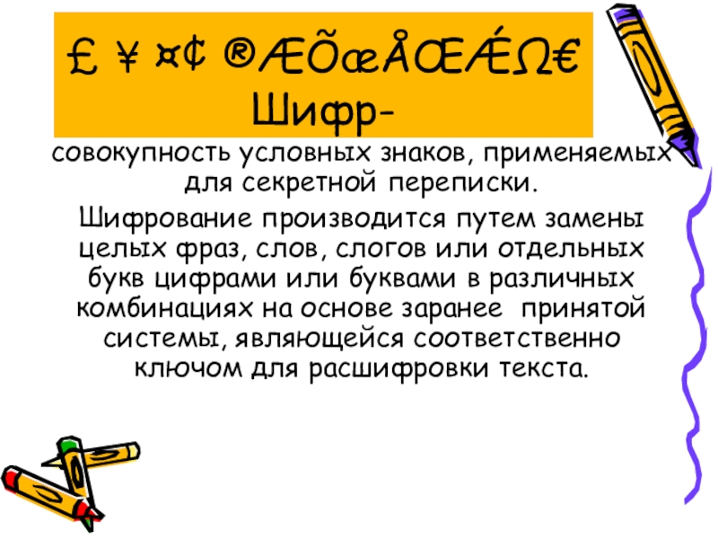 Слайд 3£ ¥ ¤¢ ®ÆÕæÅŒǼΩ€ Шифр-