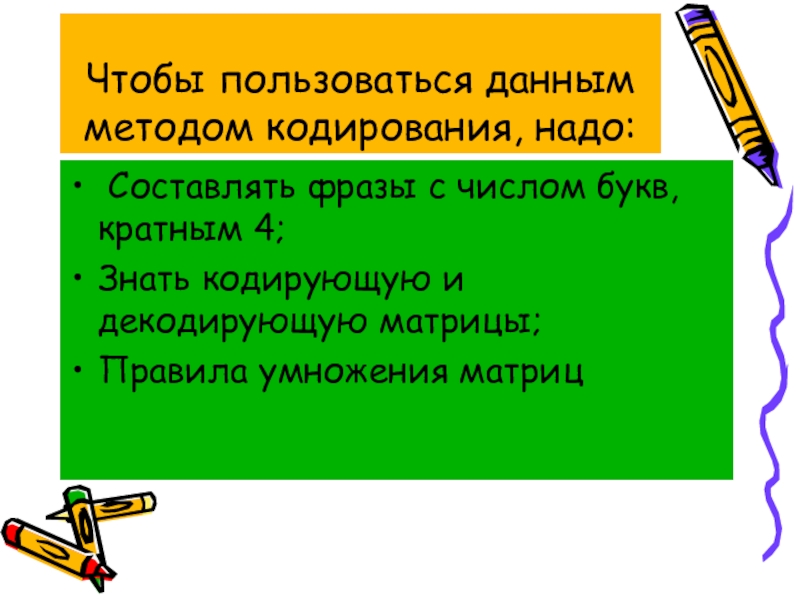 Слайд 18Чтобы пользоваться данным методом кодирования, надо: