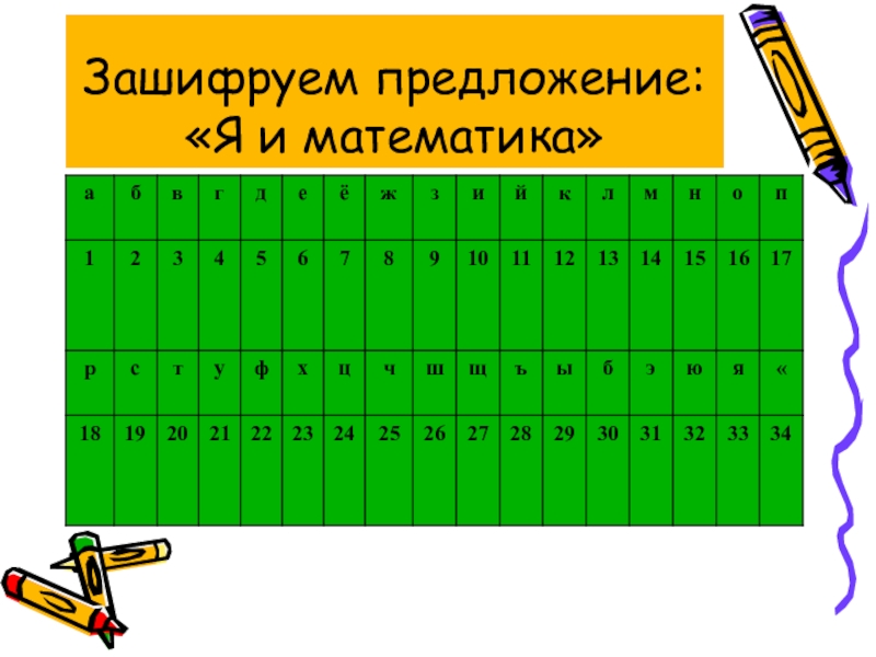 Слайд 13Зашифруем предложение: «Я и математика»
