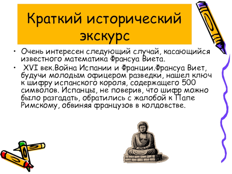 XVI век.Война Испании и Франции.Франсуа Виет, будучи молодым офицером разведки, нашел ключ к шифру испанского короля, содержащего 500 символов. Испанцы, не поверив, что шифр можно было разгадать, обратились с жалобой к Папе Римскому, обвиняя французов в колдовстве.