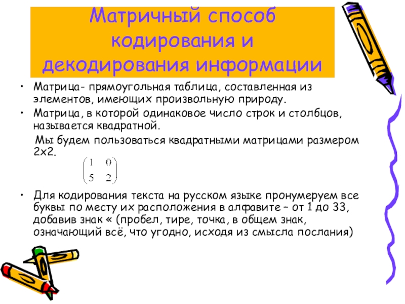 Слайд 12Матричный способ кодирования и декодирования информации