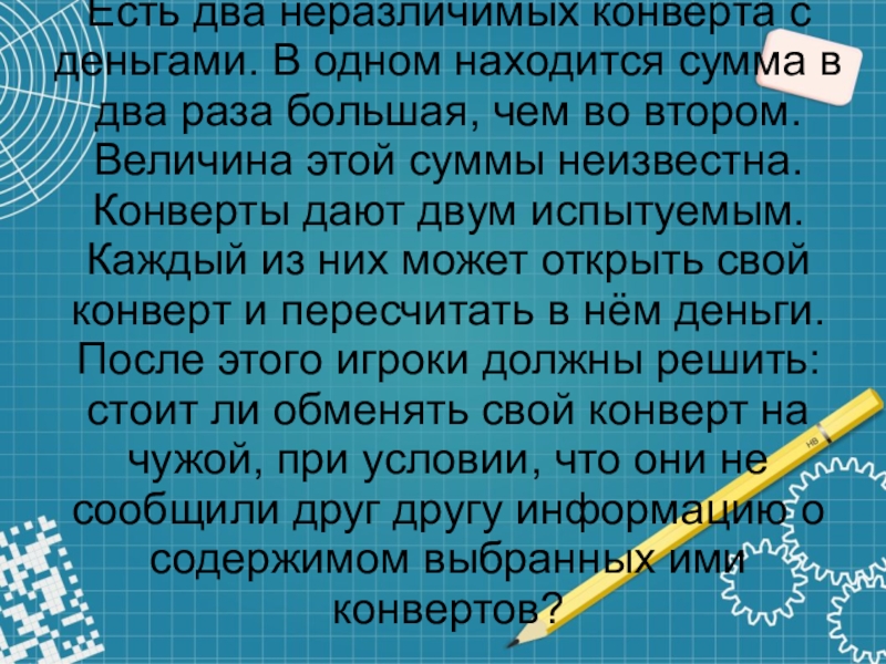 два раза большая, чем во втором. Величина этой суммы неизвестна. Конверты дают двум испытуемым. Каждый из них может открыть свой конверт и пересчитать в нём деньги. После этого игроки должны решить: стоит ли обменять свой конверт на чужой, при условии, что они не сообщили друг другу информацию о содержимом выбранных ими конвертов?
