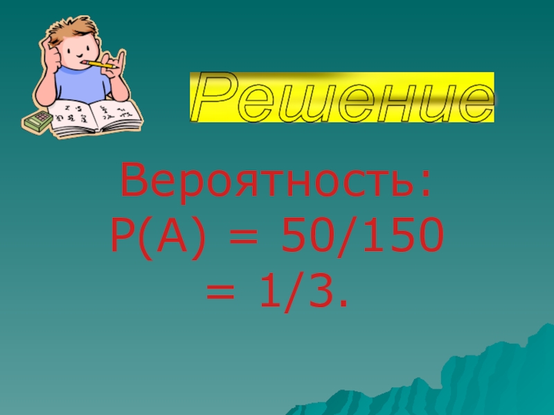 Вероятность: P(A) = 50/150 = 1/3.