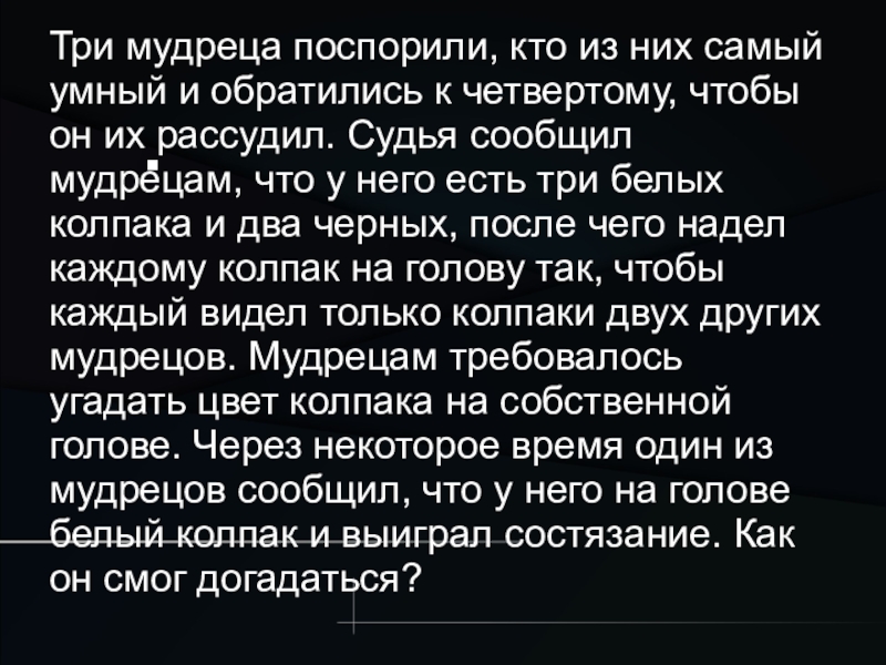 четвертому, чтобы он их рассудил. Судья сообщил мудрецам, что у него есть три белых колпака и два черных, после чего надел каждому колпак на голову так, чтобы каждый видел только колпаки двух других мудрецов. Мудрецам требовалось угадать цвет колпака на собственной голове. Через некоторое время один из мудрецов сообщил, что у него на голове белый колпак и выиграл состязание. Как он смог догадаться?