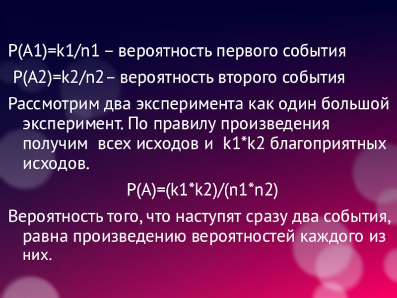 Слайд 21P(A1)=k1/n1 – вероятность первого события