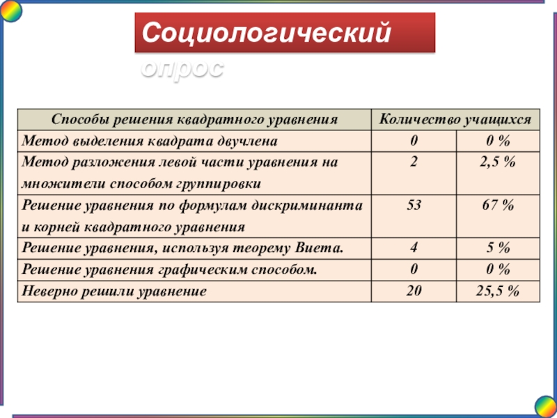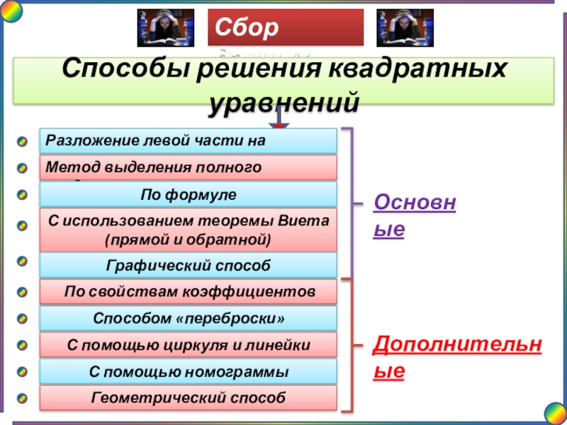 Основным в решении квадратных уравнений является правильно выбрать рациональный способ решения и применить алгоритм решения