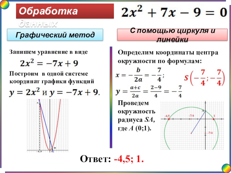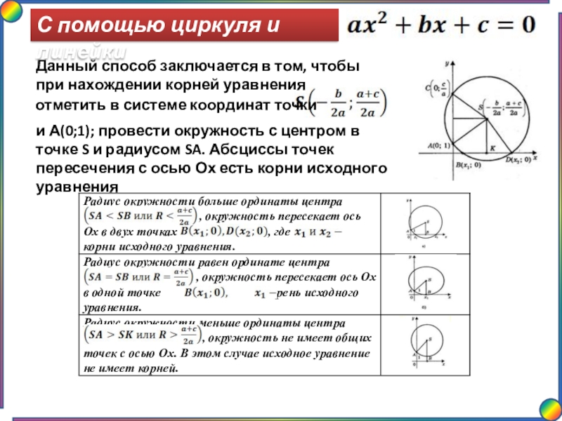 и А(0;1); провести окружность с центром в точке S и радиусом SA. Абсциссы точек пересечения с осью Ох есть корни исходного уравнения
