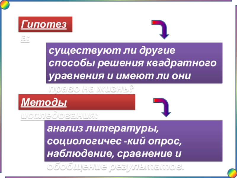 анализ литературы, социологичес -кий опрос, наблюдение, сравнение и обобщение результатов.