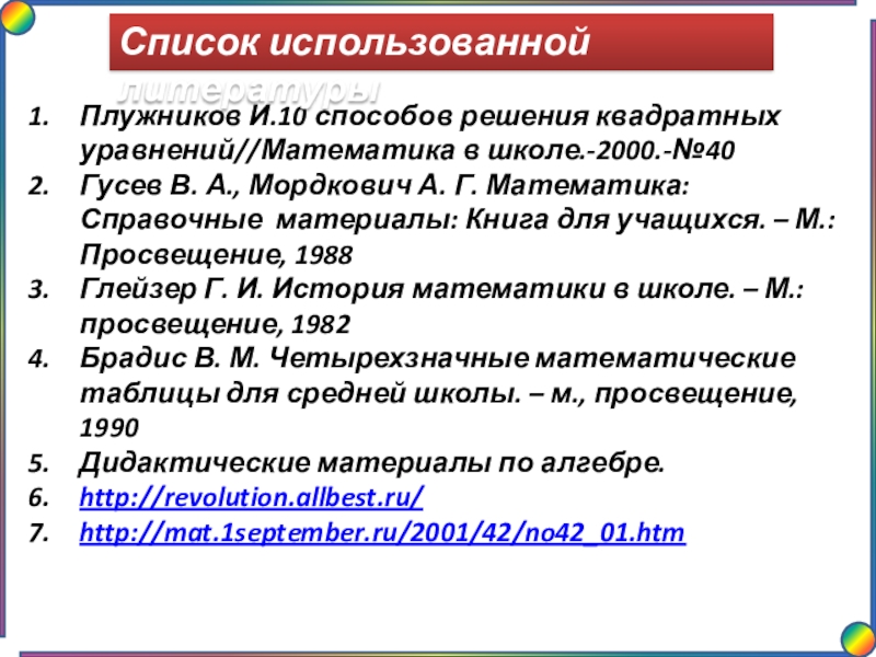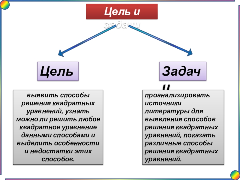 проанализировать источники литературы для выявления способов решения квадратных уравнений, показать различные способы решения квадратных уравнений.